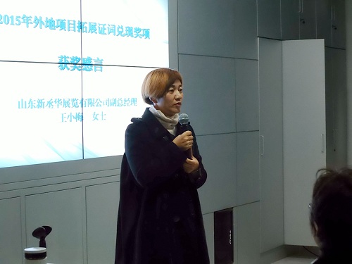 在大會(huì)進(jìn)行過程中,現(xiàn)場還迎來了激動(dòng)人心的頒獎(jiǎng)活動(dòng),臺(tái)上,由王董事長親自為公司環(huán)衛(wèi)展頒發(fā)了“2015年項(xiàng)目專業(yè)化細(xì)分、復(fù)制發(fā)展外地項(xiàng)目的拓展政策兌現(xiàn)獎(jiǎng)”。項(xiàng)目副總經(jīng)理王小梅上臺(tái)領(lǐng)獎(jiǎng)并進(jìn)行了獲獎(jiǎng)感言。