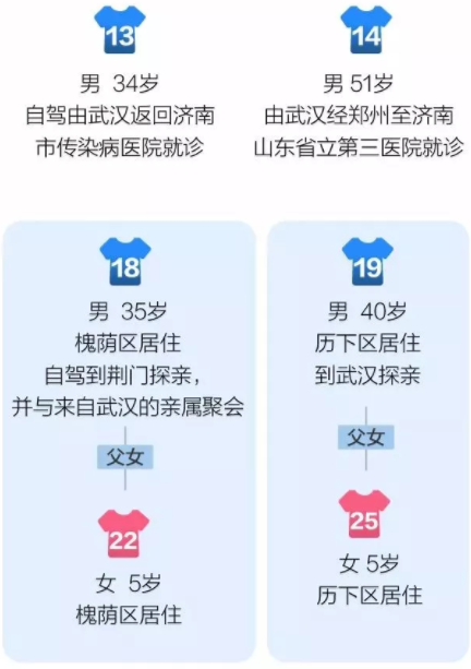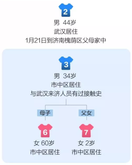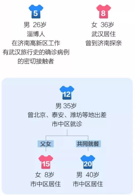 從濟(jì)南市發(fā)布的新型冠狀病毒感染的肺炎確診病例傳播圖譜中可以看出,我市第9例,第10例,第11例均為第1例確診患者的家庭成員。第6例、第7例為第3例確診患者的家庭成員。第15例為第12例確診患者的家庭成員。第17例,第21例為第4例確診病例的家庭成員。第22例為第18例確診病例的家庭成員。由此看來,在濟(jì)南市22例確診病例中有5個(gè)家庭出現(xiàn)了集中發(fā)病,涉及14人。