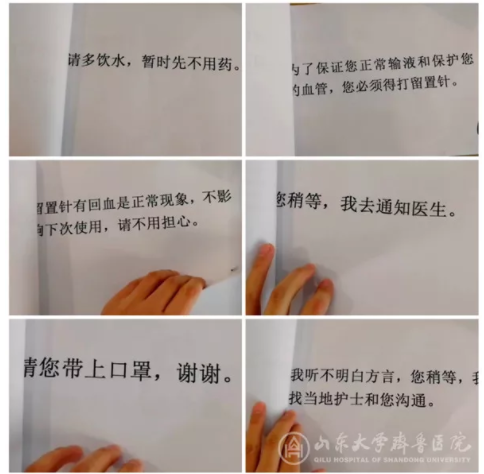 在臨床工作實(shí)戰(zhàn)中,我發(fā)現(xiàn)我們山東醫(yī)療隊(duì)和湖北當(dāng)?shù)氐幕颊哌M(jìn)行溝通存在障礙,因?yàn)楹秉S岡方言很重,而且南方方言和我們北方話差異很大,有時(shí)候我說(shuō)的患者不明白,患者說(shuō)的我聽不懂,在這樣的情況下,我?guī)椭t(yī)療隊(duì),初步制訂了大別山區(qū)域醫(yī)療中心護(hù)患溝通本(山東醫(yī)療隊(duì)),里面有我們平時(shí)工作中和患者交流比較多的問(wèn)題的簡(jiǎn)易回答,在語(yǔ)言不通時(shí),我們拿出護(hù)患溝通本,患者看到文字,就能理解。我們計(jì)劃隨著工作的慢慢進(jìn)展再一步步慢慢修訂護(hù)患溝通本。