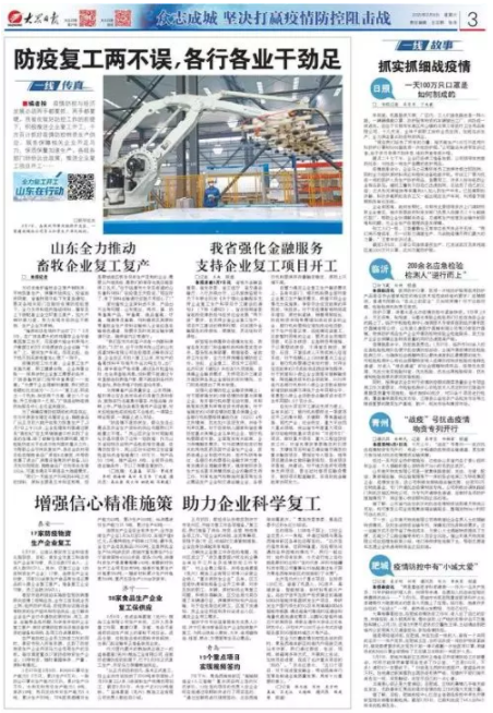 ■編者按 疫情防控與經(jīng)濟(jì)發(fā)展必須兩手都要抓、兩手都要硬。我省在做好防控工作的前提下,積極推進(jìn)企業(yè)復(fù)工開工,千方百計抓好疫情防控物資生產(chǎn)供應(yīng),服務(wù)保障相關(guān)企業(yè)開足馬力,保質(zhì)保量加速生產(chǎn)。各級各部門紛紛出臺政策,推進(jìn)企業(yè)復(fù)工項目開工……