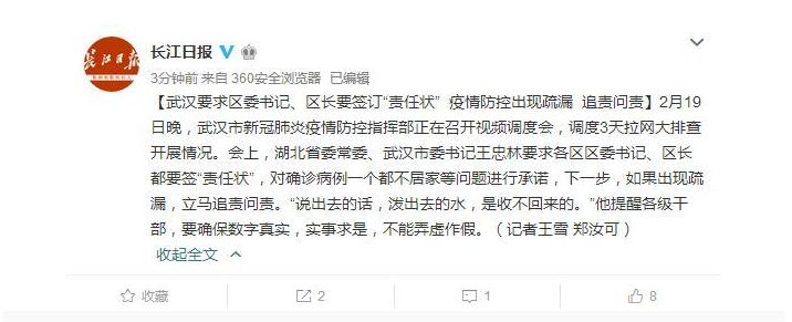 【武漢要求區(qū)委書記、區(qū)長要簽訂“責(zé)任狀” 疫情防控出現(xiàn)疏漏 追責(zé)問責(zé)】2月19日晚,武漢市新冠肺炎疫情防控指揮部正在召開視頻調(diào)度會(huì),調(diào)度3天拉網(wǎng)大排查開展情況。會(huì)上,湖北省委常委、武漢市委書記王忠林要求各區(qū)區(qū)委書記、區(qū)長都要簽“責(zé)任狀”,對(duì)確診病例一個(gè)都不居家等問題進(jìn)行承諾,下一步,如果出現(xiàn)疏漏,立馬追責(zé)問責(zé)。“說出去的話,潑出去的水,是收不回來的。”他提醒各級(jí)干部,要確保數(shù)字真實(shí),實(shí)事求是,不能弄虛作假。(記者王雪 鄭汝可)