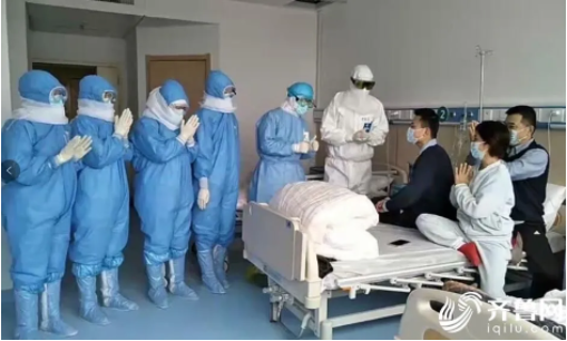 元宵節(jié)當天,山東援助湖北醫(yī)療隊第一批隊長賈新華和其他醫(yī)護人員查房,并將即將出院的消息告訴一家三口。