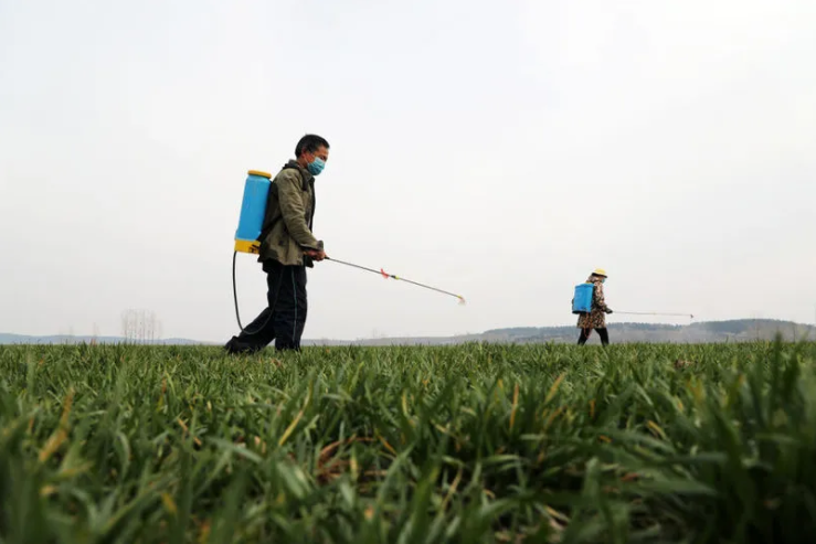 2月20日,山東省臨沂市郯城縣郯城街道三井村村民在麥田間噴灑農(nóng)藥。(張春雷 攝)