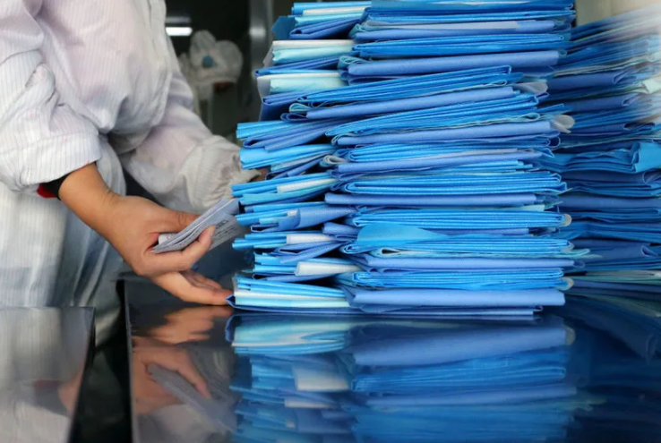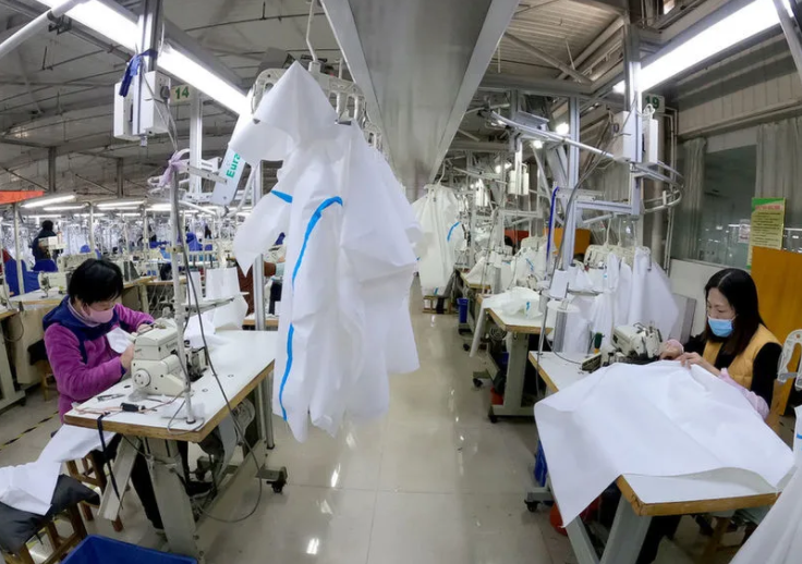 1月30日,棗莊市山東康力醫(yī)療器械科技有限公司的生產(chǎn)車間工人,在嚴(yán)格消毒環(huán)境下生產(chǎn)醫(yī)用防護服。(孫中喆 攝)