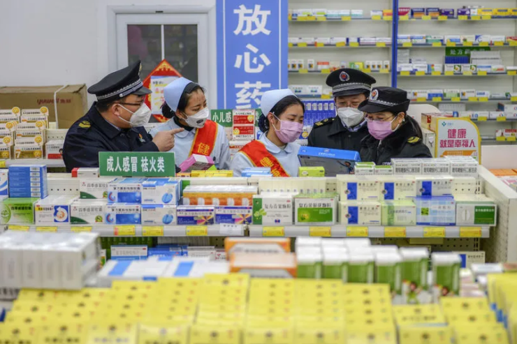 2月5日,山東省棗莊市臺兒莊區(qū)市場監(jiān)督管理局執(zhí)法人員在一家藥店對藥價進行檢查。(高啟民 攝)