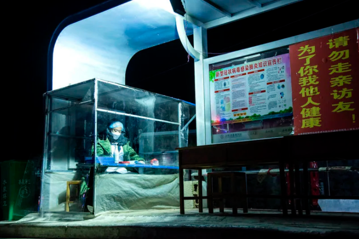 2月6日凌晨 ,山東省棗莊市山亭區(qū)水泉鎮(zhèn)夏嶺疫情防控卡點,夜班執(zhí)勤人員在“膠囊哨所”里整理《外來人員登記表》。(劉明祥 攝)
