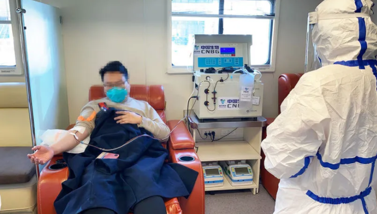 2月22日,山東省鄒平市首例新冠肺炎治愈患者賈某(左)在山東省血液中心采血站成功捐獻血漿。(董乃德 攝)