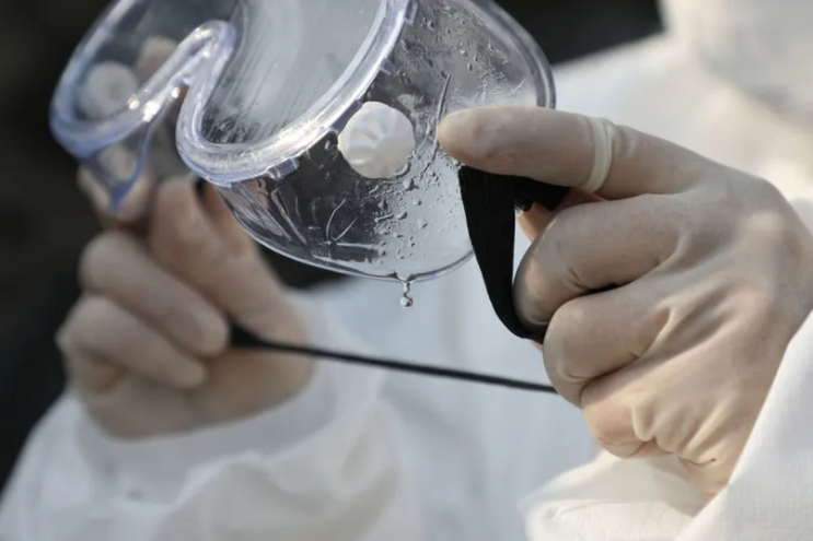 2月10日,山東省臨沂市沂南縣疾控中心檢驗員王莉莉倒出護目鏡里積存的汗水。(杜昱葆 攝)