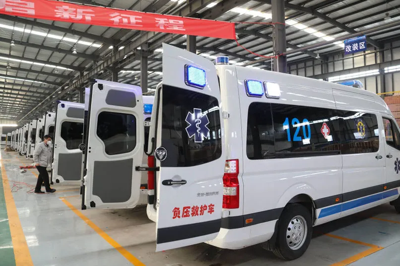 2月11日,位于山東濰坊的福田山東多功能汽車廠,工作人員裝配負(fù)壓救護車。(孫樹寶 攝)