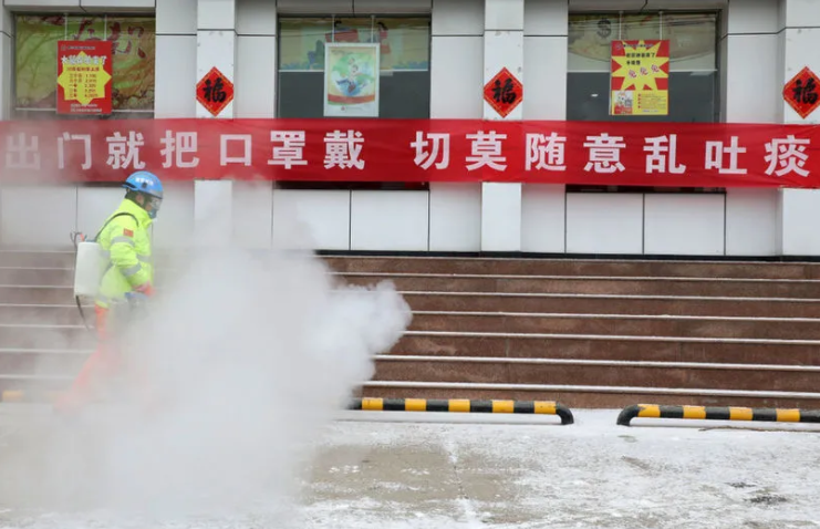 2月6日,山東省濱州市博興縣錦秋街道灣頭村,當(dāng)?shù)?ldquo;9958應(yīng)急救援隊”志愿者正在對村里的主要通道進行消殺作業(yè)。(陳彬 攝)