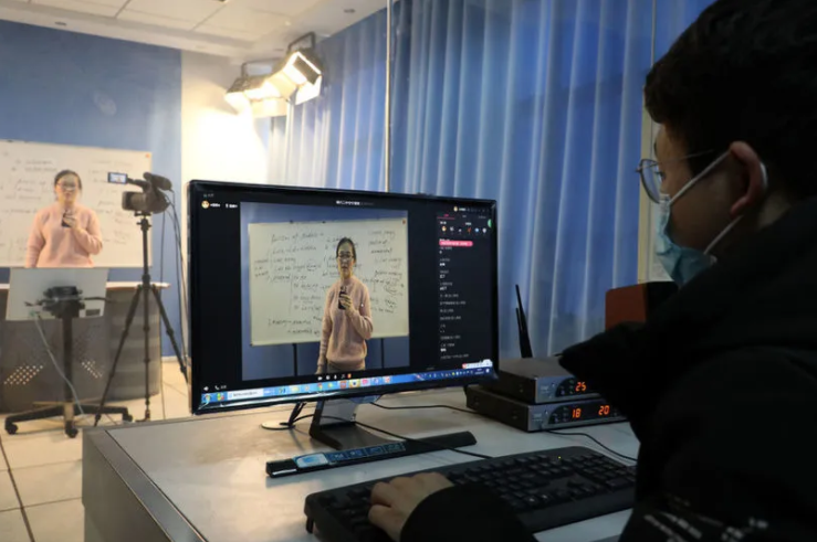 2月11日,山東省濱州市博興縣第三中學(xué),一名工作人員利用電腦端實時監(jiān)控“網(wǎng)絡(luò)直播教學(xué)”進程,隨時提供直播技術(shù)支持。(陳彬 攝)
