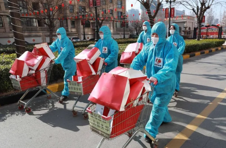 1月31日,山東臨沂市蘭山區(qū)藍鉆莊園小區(qū),物業(yè)服務(wù)中心員工將愛心菜裝車推進小區(qū)配送到被隔離的業(yè)主。(朱武濤 攝)