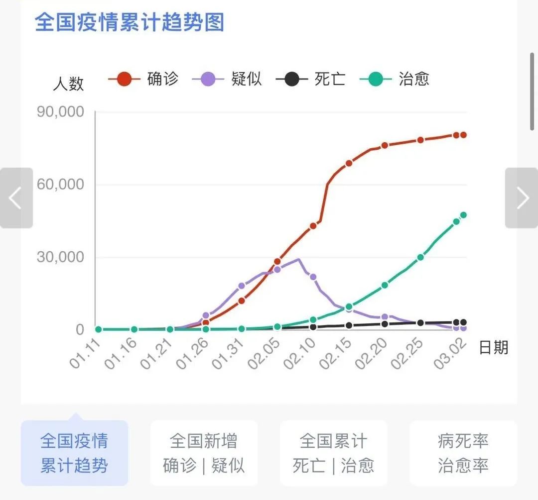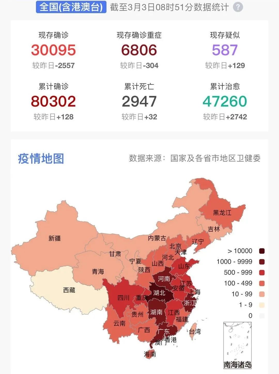 據(jù)31個?。ㄗ灾螀^(qū)、直轄市)和新疆生產(chǎn)建設(shè)兵團報告,現(xiàn)有確診病例30004例(其中重癥病例6806例),累計治愈出院病例47204例,累計死亡病例2943例,累計報告確診病例80151例,現(xiàn)有疑似病例587例。累計追蹤到密切接觸者664899人,尚在醫(yī)學(xué)觀察的密切接觸者40651人。