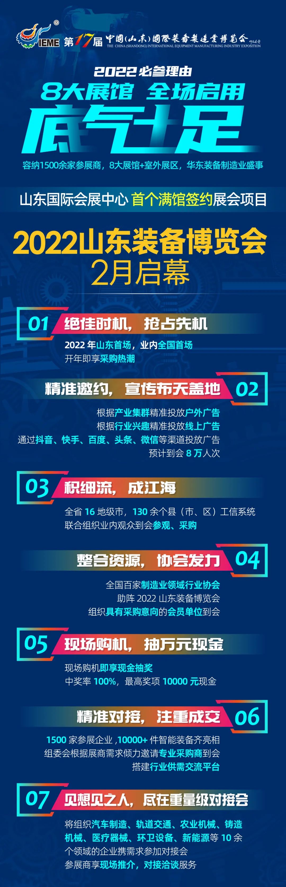 由中國機械工業(yè)聯(lián)合會、山東省工業(yè)和信息化研究院主辦、濟南市機器人與高端裝備產(chǎn)業(yè)協(xié)會、山東新丞華展覽有限公司承辦的2022第十七屆中國(山東)國際裝備制造業(yè)博覽會定于2022年2月25-28日在山東國際會展中心舉辦,主要展示數(shù)控機床、激光切割、工業(yè)自動化、工業(yè)機器人、智能裝備、功能部件等方面的最新技術(shù)及產(chǎn)品。本屆展會開設(shè)8大展館,面積將超過10萬平方米,匯聚1500家知名展商。展會全力推進高端裝備發(fā)展,助力制造強國建設(shè)。打造年度山東首個規(guī)模大、質(zhì)量高、影響力強的行業(yè)大展。