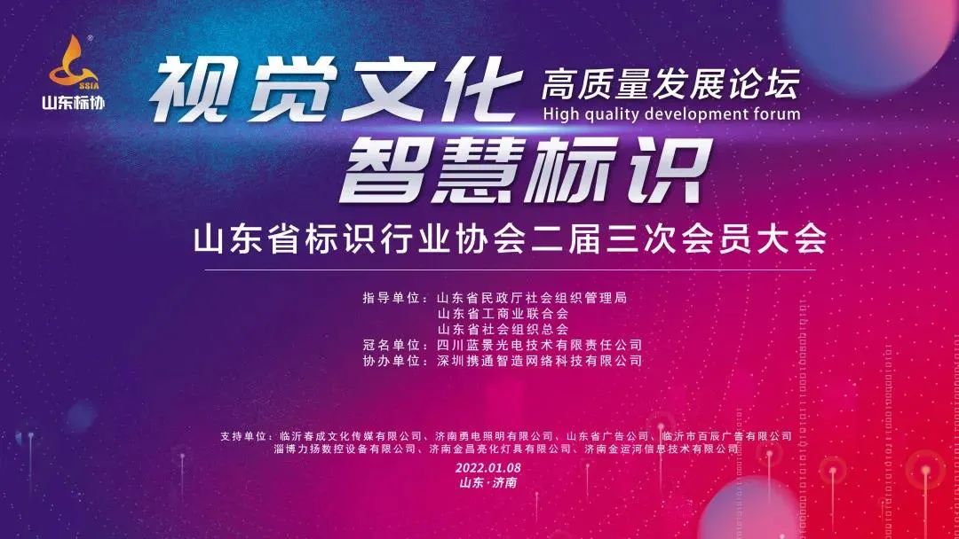 2022年1月8日,山東省標(biāo)識(shí)行業(yè)協(xié)會(huì)二屆三次會(huì)員大會(huì)暨“視覺(jué)文化、智慧標(biāo)識(shí)”高質(zhì)量發(fā)展論壇在山東濟(jì)南鉑爾國(guó)際酒店隆重召開(kāi),各界領(lǐng)導(dǎo)、各協(xié)會(huì)會(huì)長(zhǎng)、嘉賓、專(zhuān)家,山東標(biāo)協(xié)副會(huì)長(zhǎng)、理事、監(jiān)事、優(yōu)秀企業(yè)等300余位代表齊聚一堂,共同見(jiàn)證此次大會(huì)的盛大舉行。