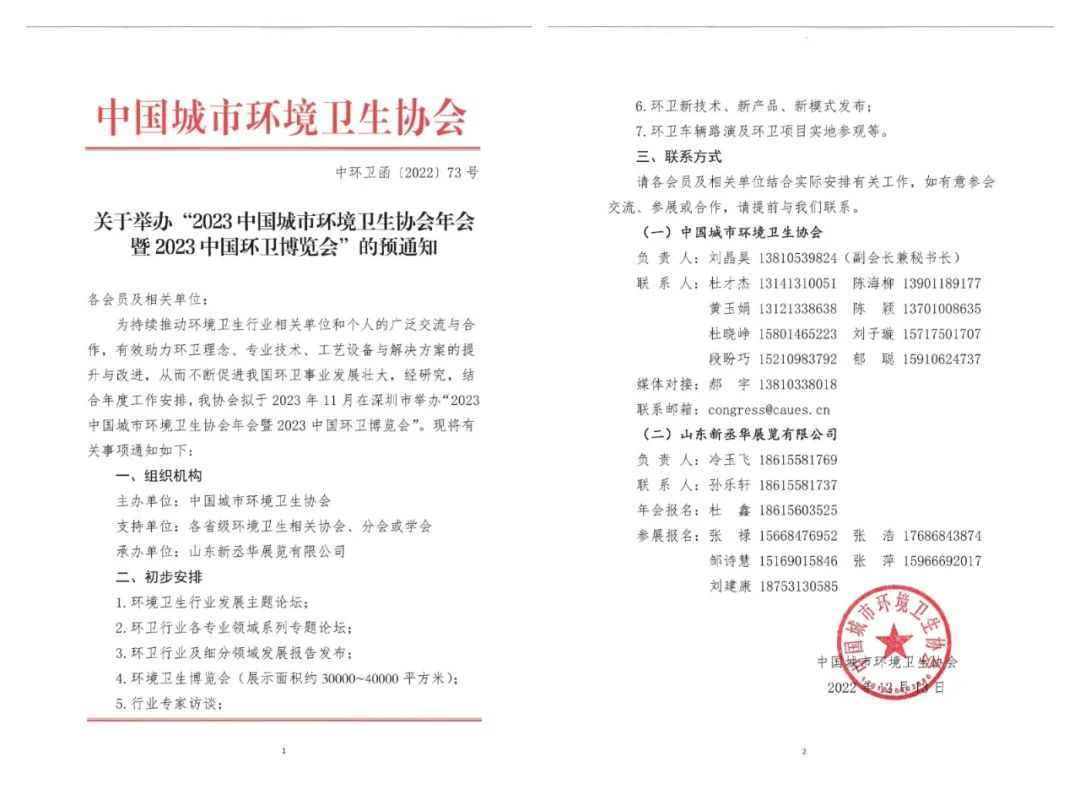 為持續(xù)推動(dòng)環(huán)境衛(wèi)生行業(yè)相關(guān)單位和個(gè)人的廣泛交流與合作,有效助力環(huán)衛(wèi)理念、專業(yè)技術(shù)、工藝設(shè)備與解決方案的提升與改進(jìn),從而不斷促進(jìn)我國(guó)環(huán)衛(wèi)事業(yè)發(fā)展壯大,經(jīng)研究,結(jié)合年度工作安排,我協(xié)會(huì)擬于2023年11月在深圳市舉辦“2023中國(guó)城市環(huán)境衛(wèi)生協(xié)會(huì)年會(huì)暨2023中國(guó)環(huán)衛(wèi)博覽會(huì)”?,F(xiàn)將有關(guān)事項(xiàng)通知如下:
