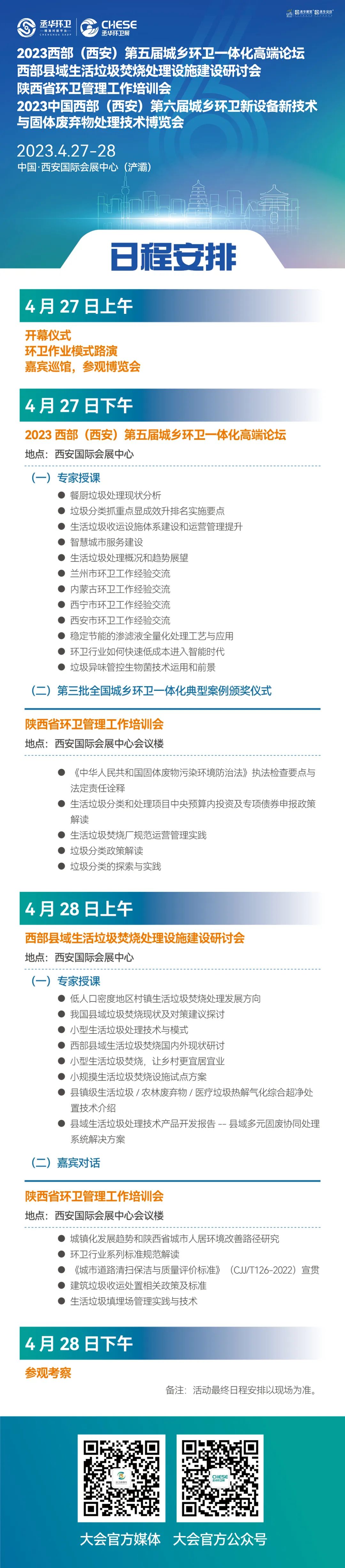 2023西部(西安)第五屆城鄉(xiāng)環(huán)衛(wèi)一體化高端論壇、西部縣域生活垃圾焚燒處理設(shè)施建設(shè)研討會及陜西省環(huán)衛(wèi)管理工作培訓(xùn)會各有側(cè)重,邀請政府部門領(lǐng)導(dǎo)、知名專家學者、品牌企業(yè)大咖等共同參與,以專家授課、嘉賓對話、城市交流等多種形式,助推西部地區(qū)環(huán)衛(wèi)行業(yè)新發(fā)展!應(yīng)廣大參會代表和觀眾要求,現(xiàn)就整體活動初步日程安排進行公布,歡迎了解!
