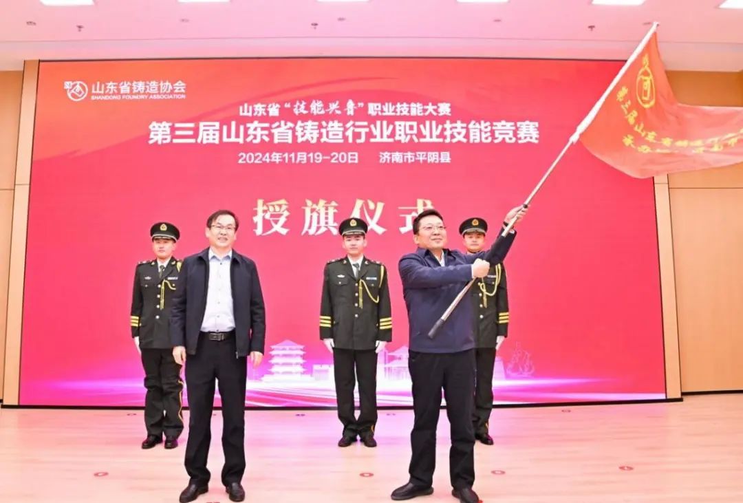 開(kāi)幕式的一大亮點(diǎn)是競(jìng)賽賽旗的交接儀式。由山東省國(guó)防機(jī)械電子工會(huì)主席吳興波代表本次競(jìng)賽主辦單位將賽旗鄭重地交到本次競(jìng)賽承辦方平陰縣人民政府副縣長(zhǎng)丁新普代表手中,這象征著鑄造行業(yè)技能競(jìng)賽的傳承與發(fā)展。賽旗的交接,不僅是一種儀式,更是一種責(zé)任的傳遞,激勵(lì)著每一屆的參與者為推動(dòng)行業(yè)進(jìn)步而努力奮斗。
